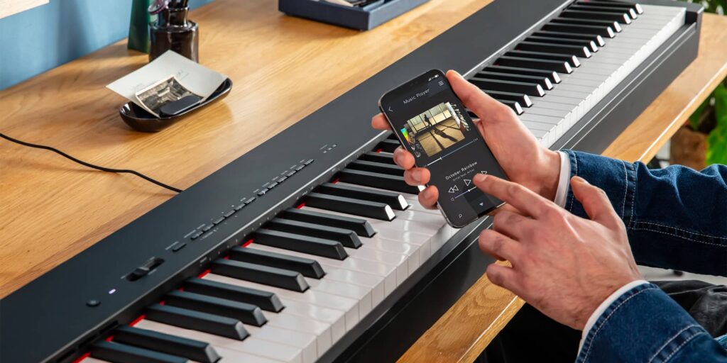 Grace à la technologie Bluetooth Audio intégrée du P225, connectez votre smartphone ou tablette à votre instrument et diffusez n’importe quel contenu audio au travers de ses haut-parleurs. Tout en continuant à jouer, vous pourrez diffuser vos musiques préférées, un accompagnement Basse / Batterie, orchestral, ou encore une version a cappella de votre chanteuse préférée pour l’accompagner au piano !