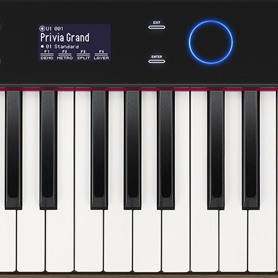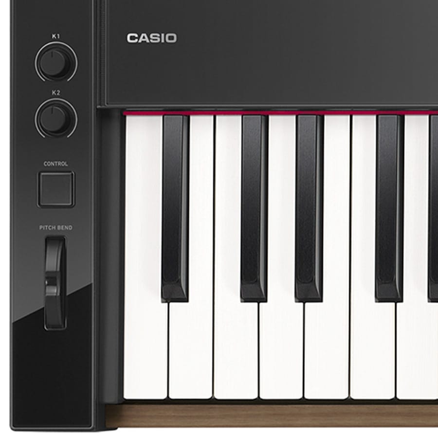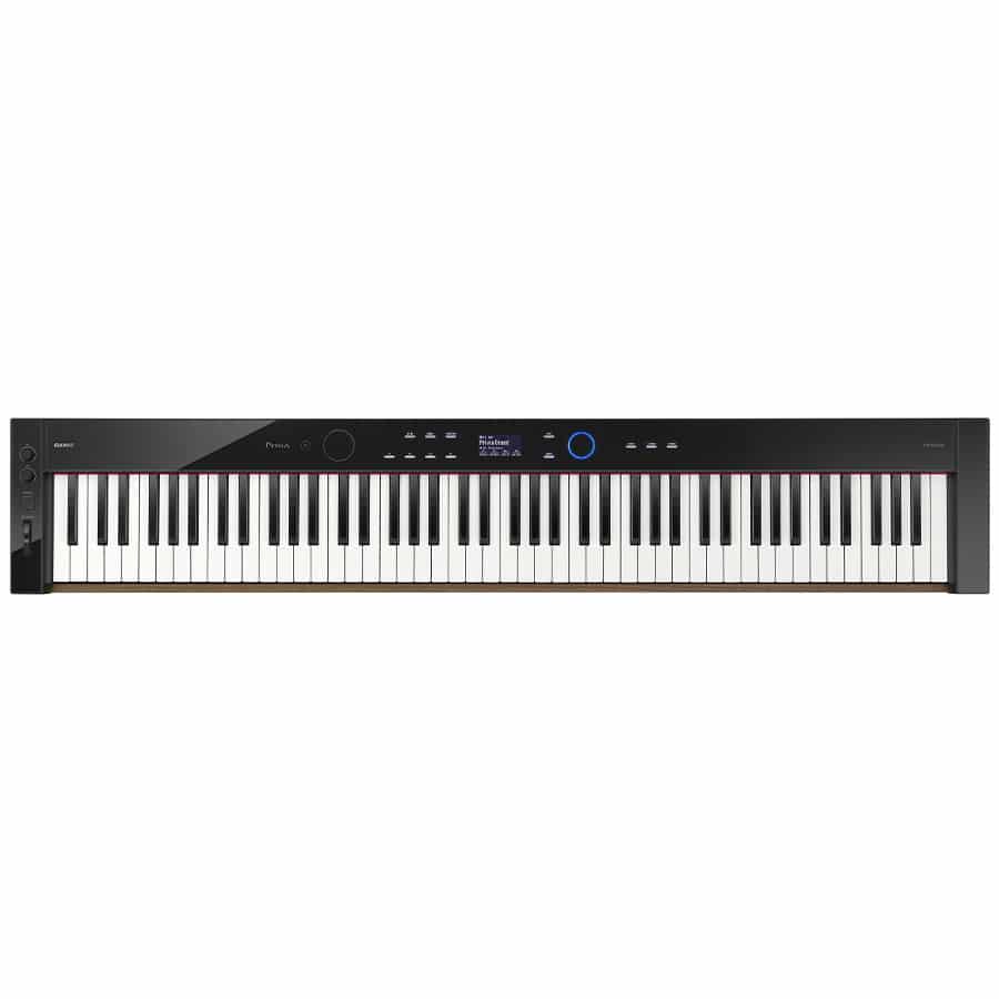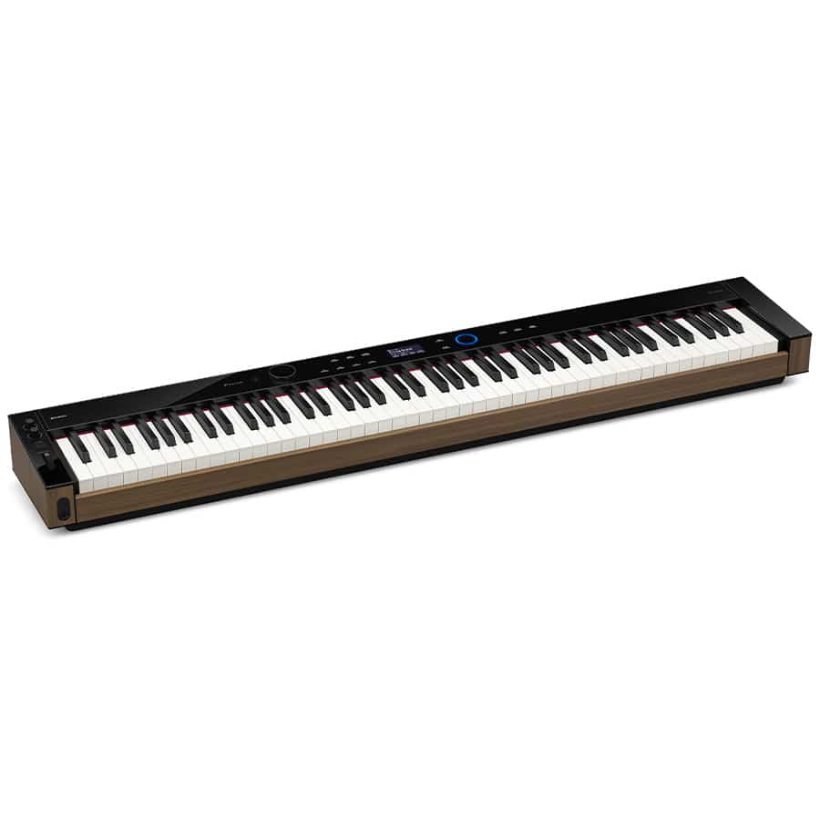Le Casio PX S6000 se distingue d'emblée par son nouveau design très réussi. Sous le capot on retrouve les principales innovations de cette nouvelle série à savoir un nouveau clavier avec des inserts en bois sur les cotés pour une réponse de clavier plus précise (Smart Hybrid Hammer Action) et un moteur sonore amélioré (Multi Dimensional Morphing Air) avec plein de nouveaux de sons de qualité (dont des nouveaux sons de pianos à queue). Mais par rapport à son petit frère le S5000, le Casio PX S6000 bénéficie de deux enceintes supplémentaires offrant un son spatialisé et très équilibré, de contrôleurs (pitch-bend, bouton, potentiomètres) pour moduler les sons en live et une prise micro pour brancher un micro et bénéficier d'effets en live sur sa voix (les chanteurs vont adorer). Bref, ce joli piano compact très performant est à mi chemin entre le piano numérique portable, l'arrangeur, un piano de scène et un clavier de contrôle. Le PX S6000 est un instrument performant qui séduira les pianistes recherchant un piano portable de qualité et polyvalent.