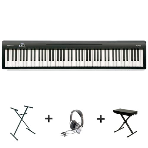 Le Roland FP-10 est la version compacte et allégée (légèrement) du Roland FP-30. Uniquement disponible en finition noir, le Roland Fp-10 s'il est moins cher que son grand-frère, offre malheureusement une polyphonie plus limitée (96 notes au lieu de 128) et surtout une amplification beaucoup moins puissante (2x6W au lieu de 2x11W). On regrette aussi l'absence d'une deuxième prise casque, de sorties audio et la possibilité de brancher un pédalier avec 3 pédales. Ces limitations destinent principalement le Roland FP-10 aux débutants ou aux pianistes qui veulent un piano portable d'appoint à budget très serré. Par contre on apprécie sa connectivité bluetooth pour communiquer avec des applications sur smartphone ou tablettes. Une fonction très rare dans cette gamme de prix. Néanmoins pour un budget légèrement supérieur, nous vous invitons à privilégier le Roland FP-30X qui demeure plus intéressant. A découvrir dans nos magasins parisiens de la rue de Lourmel et de la rue Rome.