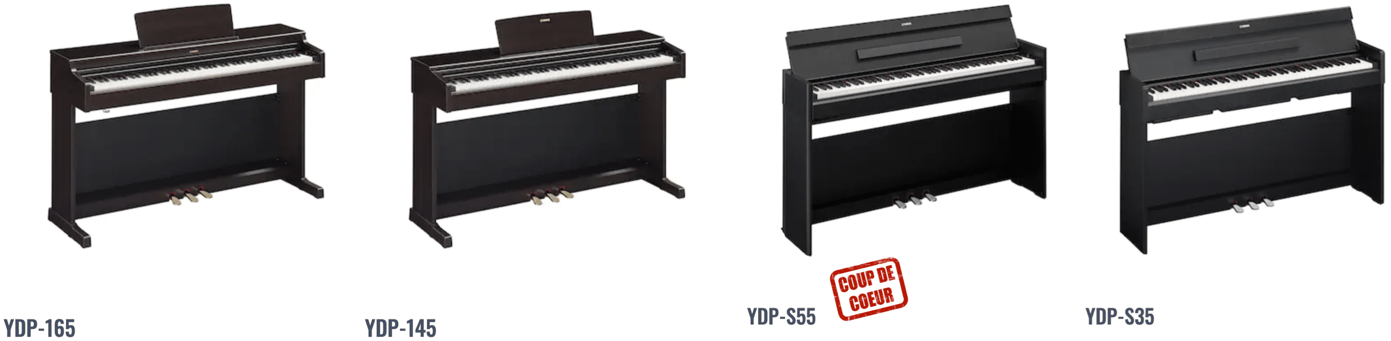 Cette gamme composée de 4 modèles est en fait divisée en 2 séries au design différent mais aux performances similaires. La série Standard avec les modèles YDP-145 et YDP-165 et leurs équivalents de la série Slim, YDP-S35 et YDP-S55. Dans cette gamme, le YDP-S55 est notre coup de coeur ! En version compacte du YDP-165, il emporte une amplification et un clavier bien meilleurs que son petit frère le S35 avec plus de précision, plus de basses et un son bien plus chaleureux.