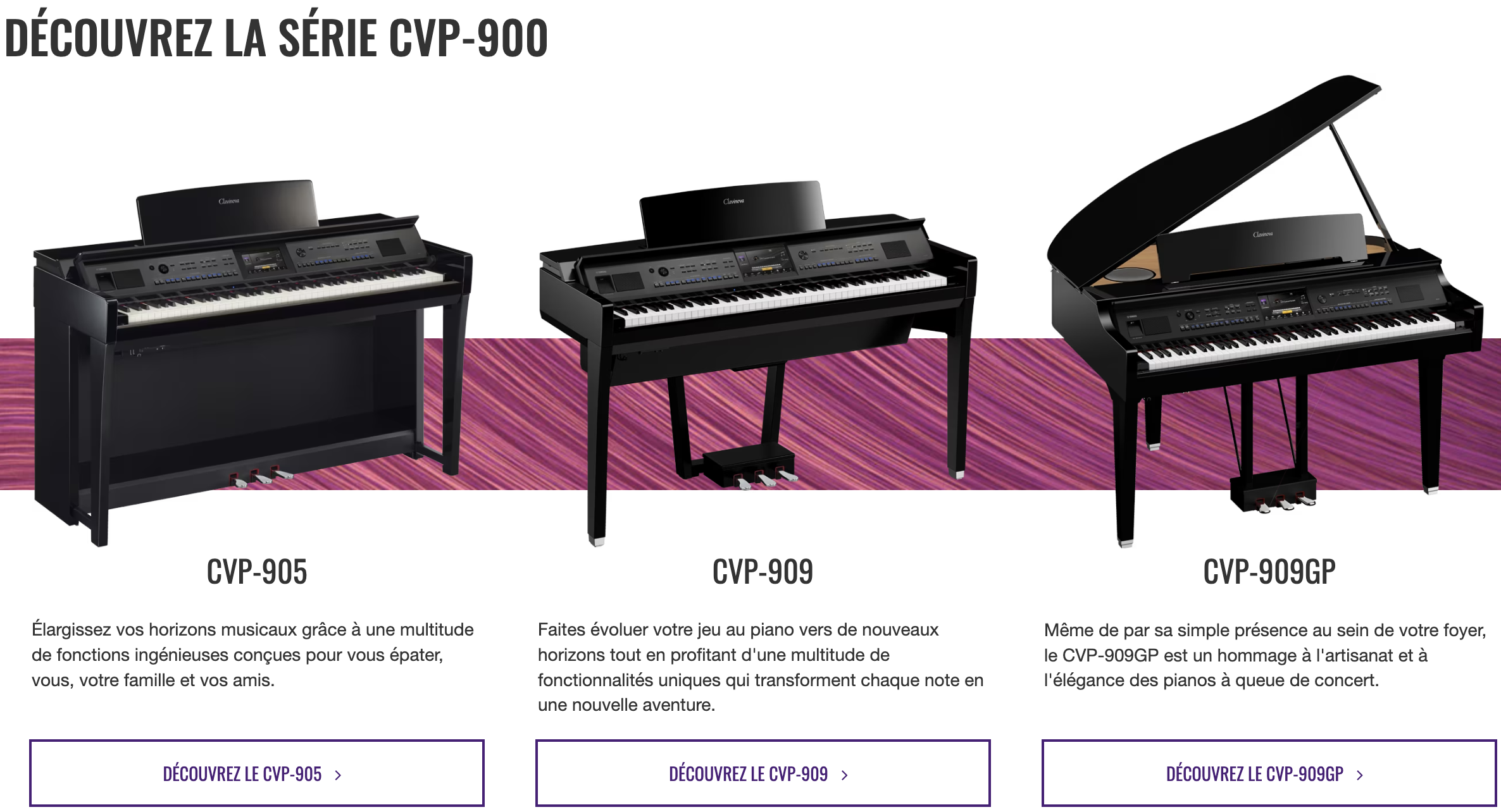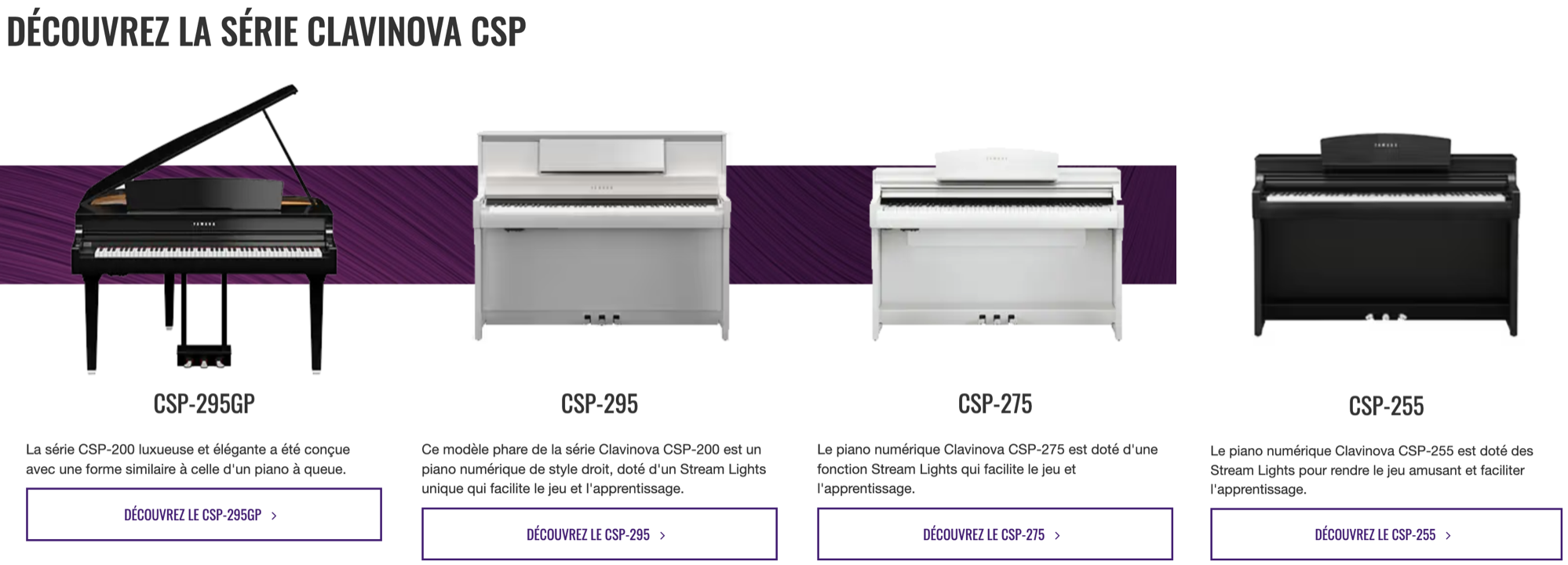 Tout comme les CLP, les CSP (ou Clavinova Smart Pianist) sont dotés d’un excellent générateur sonore, d’une bonne amplification et des mécaniques GrandTouch. Mais à la différence de ceux-ci, ils sont équipés d’une barre de guides lumineux vous indiquant quelles notes jouer lors de l’apprentissage d’un morceau ! Plus de 300 morceaux classiques et exercices d’étude technique sont disponibles à bord de ces instruments.